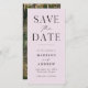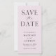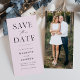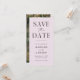 Anuncie sua data de casamento com esta na moda, foto moderna, salve o cartão de data. O design apresenta "Save the Date" (Salvar a data) na parte frontal em fontes pretas de script e serif com fundo roxo lavanda. Personalize o minimalista para salvar o anúncio de data adicionando seus nomes, data e local do casamento. A placa reverte para exibir sua foto favorita do noivado. A simples salvação do anúncio de data é perfeita para qualquer tema de casamento.