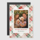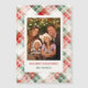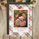 Envie seu cartões de natal personalizado com este adorável design com um modelo de foto retrato em um fundo de xadrez de cor d'água quente, vermelho rústico, verde e com casca de ovo.
