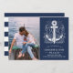 Anuncie seu casamento para a família e amigos com esses cartões salve a data de chic costeiros em azul-marinho clássico e esmaecido em branco. Design apresenta a sua foto favorita junto com uma ilustração de âncora desenhada à mão, com a inscrição "gentilmente salve a data" do dentro. Personalize esses cartões salve a data náuticos com seus nomes, data do casamento, local e site do casamento, ou uma indicação de que seguirá um convite formal. Cartões inverso a extensas faixas de marinho horizontais.