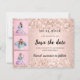 A Save the Date card for a 50th (or any age) festa de aniversário (Salvar a placa de data para uma 50th (ou qualquer idade). fundo de gradiente rosa dourado. Decorado com confete. O texto: Salvar a Data é gravado com um script de estilo com letra de tendência grande. Personalize e adicione 3 fotos. 1 folha = 1 Salve a data da borda impressa para a borda.