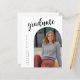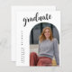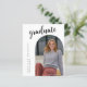 O convite à formatura tem um design moderno e elegante. A frente apresenta um grande título de script, um quadro em forma de arco que mostra o retrato do formando, e texto vertical mostrando seu nome e escola em uma fonte serif limpa. O verso mantém um estilo minimalista com um título de script em negrito, detalhes de eventos estruturados e um gráfico de boné de formatura pequeno. O design é limpo, sofisticado e fácil de ler.