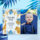 Obrigados convidados para assistir à segunda festa de aniversário do seu filho com este cartões de agradecimentos de safari da selva, com uma coleção de folhas e animais da selva de folha azul e dourada (girafa, leão, macaco) em torno das palavras "Obrigado" na tipografia desenhada à mão. Substitua facilmente a imagem por sua foto favorita do aniversariante e personalize a mensagem. A parte traseira da placa apresenta um padrão de folhagem da selva azul e dourada.