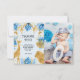Obrigados convidados para assistir à primeira festa de aniversário do seu filho com este cartões de agradecimentos de safari da selva, com uma coleção de folhagem da selva de folha azul e dourada e animais (girafa, leão, macaco) em torno das palavras "Obrigado" na tipografia desenhada à mão. Substitua facilmente a imagem por sua foto favorita do aniversariante e personalize a mensagem. A parte traseira da placa apresenta um padrão de folhagem da selva azul e dourada.
