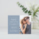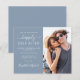 Casamento azul empoeirado e amigável economiza o anúncio de data com sua foto e "Feliz Nunca Depois" em uma mistura de simples tipografia branca moderna e um roteiro branco-na moda com baloiços. Personalize os detalhes da data e adicione seus nomes em um script semelhante a assinatura. Seus nomes e data de casamento estão juntos por um coração nas costas.