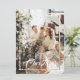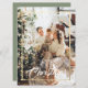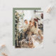 Feliz Natal com uma estrela dourada confetti e uma moldura dourada para fotografia. Personalize a foto e personalize os detalhes para adicionar o nome da família. Adicione suas mensagens ou sessões de saudação às costas. Um fundo verde sábio com a tipografia cursiva moderna de Branca de Neve.