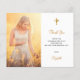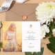 Um cartões de agradecimentos de confirmação moderno e elegante para ela e para ele. Um fundo branco chic decorado com uma cruz de ouro. Personalize e adicione sua foto, obrigado nota e nome.