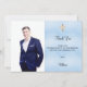 Um cartões de agradecimentos de confirmação moderno e elegante. Um fundo metálico azul-claro, com aspecto fino, decorado com uma cruz de ouro. Personalize e adicione sua foto, obrigado nota e nome.
