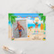Foto: convite de aniversário de Luau convite havaiano para o garoto. Bonito convite havaiano para o aniversário de uma menina apresentando um menino loiro com guitarra, surfs, praia tropical e oceano azul, sigla de aloha e alguns equipamentos de festa tropical. Basta editar este modelo fácil de usar no menu Personalização.