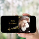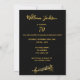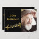 Fundo preto com notas de música de ouro. Com o texto: 70 (ou qualquer idade) Aniversário! na frente. Modelo para sua foto. Um convite de aniversário para homens. Adicione os detalhes do evento no verso.