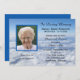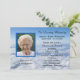 Este incrível convite do serviço de memorial mostra a foto do seu ente querido cercado por um quadro azul nas nuvens. Abaixo da foto estão as palavras "O amor vive em nossas memórias." À direita da foto estão as palavras "In Loving Memory", o nome do seu amado, datas e todos os seus detalhes de convites para o serviço de memórias. O verso do convite é o mesmo azul adorável que o quadro. Este é um belo convite para um Serviço Memorial. Compaixão por direitos autorais