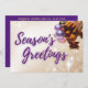 Um cartão de boas-vindas de Natal com gravuras e ornamentos de canela em fundo cintilante com letra de brilho roxa. Adicione a sua fotografia favorita à parte de trás do cartão e escreva uma saudação pessoal aos seus amigos e familiares.