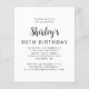 A frente deste convite de 90 de aniversário apresenta a foto do convidado de honra com uma sobreposição de texto preto. A palavra "torcida" aparece em um roteiro elegante de caligrafia, seguido de "até 90 anos" e o nome de convidado de honra e aniversário em sans serif font. Uma tela branca ajuda a fazer o pop de texto. Personalize o lado inverso com o nome e os detalhes da parte em um plano de fundo branco. Uma forma excelente de celebrar alguém que está fazendo noventa anos! (NOTA: Os envelopes não são incluídos automaticamente com este convite orçamental. Para adicionar envelopes ao seu pedido, use o menu suspenso "Envelopes".)