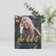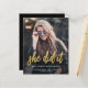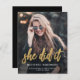 Anúncio de graduação moderno com uma foto vertical personalizada. A frase "ela o fez" aparece em um roteiro de folha de alumínio dourada, com o nome do formando, a escola e o ano de graduação abaixo em letra branca sans serif. Substitua facilmente a imagem de amostra pela foto do seu próprio formando. Uma tela de gradiente preto ajuda a garantir que o texto seja pop. A parte traseira da placa é preta e sólida. Ideal para segundo grau ou formandos.