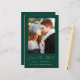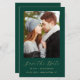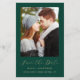 Este simples e minimalista Cartão Salvar a Data apresenta uma foto vertical acima das palavras "Salvar a Data" em um elegante roteiro de escrita manual dourada, seguido pelos nomes do casal, data do casamento e cidade em sans serif em um fundo verde esmeralda. Adicione uma mensagem mais detalhada com informações adicionais na parte de trás, juntamente com um código QR que os seus convidados podem usar para visitar o seu site de casamento.