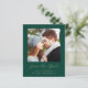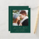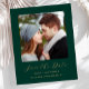 Este simples e minimalista Cartão Salvar a Data contém uma foto quadrada acima das palavras "Salvar a Data" em um elegante roteiro de escrita manual dourada, seguido pelos nomes do casal, data do casamento e cidade em sans serif em um fundo verde esmeralda. Adicione uma mensagem mais detalhada com informações adicionais sobre o contrário.