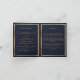 Um elegante programa de 4 páginas. Um fundo azul escuro, uma falso estrutura dourada, florais azuis e espaço para sua foto na frente. Personalize e adicione nome, datas e texto.