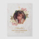 Este elegante desenho geométrico floral tem uma foto de menina substituível em uma moldura irregular dourada formada por dois hexágonos dourados que se sobrepõem, com uma cruz dourada no topo e com buquês de orquídeas rosa e branca sobre ela, para cima à direita e para baixo à esquerda. Sob a moldura, o nome é escrito em uma elegante caligrafia, o restante em letras maiúsculas. Todo o texto é dourado. O fundo é mármore branco.