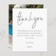 Um Simples Casamento De Fotos De Script Obrigado. Um alternativo MENOR de 4,5" x 5,6", compatível com o orçamento. Disponível em um STOCK de PLACA SEMI GLOSS 110 lb ou um STOCK de PAPEL THINNER SATIN FINISH 80 lb. Os envelopes são um extra opcional. Um elegante design de tipografia minimalista com um roteiro de estilo de escrita manual para Obrigado. No verso, substitua a imagem de exemplo pela sua favorita do seu partido como guardiã dos seus convidados. Personalize facilmente o resto do texto com sua mensagem e seu nome.