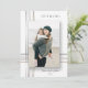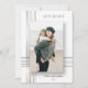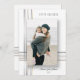 Sua foto de feriado fará uma declaração elegante com este design de modelo de foto com bandas modernas de ouro e gradiente prateado e efeito de sombra de queda profunda com campos de texto editáveis. A parte de trás apresenta um modelo de foto e campos de texto adicionais.