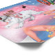 uma pintura aquosa abstrato colorida ilustrando uma deusa adormecida em frente a um fundo colorido, sonhando com uma buzina cheia, uma pilha branca, um galho com bagas e um jovem deus masculino, tocando em uma lira enquanto pedalava nas costas de uma leoa muscular branca rugindo.