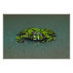 Um sapo (Bombina orientalis) de barbatana a solo, descansado numa pequena piscina de água. O verde brilhante contrasta com as manchas pretas escuras em todo o corpo enquanto a água parada proporciona um reflexo perfeito