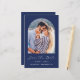 Este simples e minimalista Cartão Salvar a Data apresenta uma foto vertical em forma de arco acima das palavras "Salvar a Data" em um elegante guião branco, seguido dos nomes do casal, da data do casamento e da cidade em sans serif em um fundo azul marinho. Adicione uma mensagem mais detalhada no verso, juntamente com um código QR para ajudar seus convidados a visitar seu site de casamento.