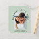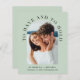 Um convite verde para casamento, amigável com orçamento moderno, com sábio, apresentando sua foto em um quadro de arco cercado por "Ter e segurar" em texto elegante. Sob sua foto, adicione seus nomes, data do casamento e local. No verso, personalize seu convite em uma simples tipografia e insira seu endereço no site do casamento para criar um código QR para seus convidados digitalizarem para RSVP on-line e obter detalhes adicionais de casamento, como acomodações.