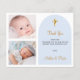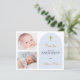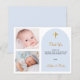 Um cartões de agradecimentos de batismo moderno e elegante. Um fundo branco e azul-claro chic decorado com uma cruz dourada falsa e uma armação de arco. Personalize e adicione duas fotos dos meninos, obrigado nota e nomes.