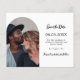 Uma foto Salve o cartão de data do seu casamento. Na frente: adicione seu próprio dentro de foto de tamanho vertical ao quadro de fotos de arco. Um fundo branco chic, texto preto. Modelos para nomes e data. O nome e o texto: Salvar a Data são escritos com um script de estilo moderno com letra manual. Voltar: você pode adicionar mais texto se quiser. Vá para a ferramenta design e adicione a camada traseira. 1 folha = 1 Salve a data da borda impressa para a borda.