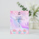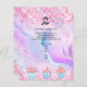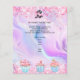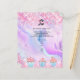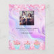 Personalize e adicione o logotipo, o nome, o endereço e o texto da sua empresa. Pastos azuis, cor-de-rosa, roxos, cor-de-rosa, plano de fundo holográfico decorado com confete e cupcakes. Voltar: adicione uma foto e conte a história sobre sua marca.