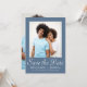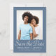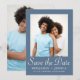Este casamento chic salve o cartão de anúncio de data com duas fotos e branco elegante salve o roteiro de caligrafia de data em um fundo azul empoeirado. O verso é uma foto de cheio. Avise aos hóspedes que você os convidará para o próximo casamento com esta simples foto minimalista, salve o cartão de data (os convites clássicos de coordenação de casamento podem ser enviados posteriormente e estão disponíveis para serem comprados separadamente).