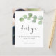 Elegante Foto Do Script Eucalyptus Leaf Muito Obrigado. Um alternativo de 4,5 pol x 5,6 pol com preço inferior. Disponível em um STOCK DE CARTÃO SEMI-GLOSS 110 lb, que é a opção padrão (mais espesso para convites), OU um STOCK de PAPEL THINNER FINISH 80 lb FINISH (ideal para gabinetes). Os envelopes são um extra opcional e são ligeiramente maiores que o tamanho da placa. Um galho elegante de folhas verdes de eucalipto flui parcialmente do lado direito, com a tipografia set Obrigado em um estilo moderno manuscrito. No verso, troque sua foto favorita do dia (de orientação para retratos). O resto do texto na frente você pode facilmente personalizar para suas próprias palavras.