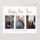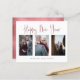 Cartão de saudação de 3 fotos de colagem Elegante de Orçamento de Ano Novo. O verso tem mensagens e fotos personalizadas que você também pode editar. Apresenta quadros vermelhos para fotos. Projetado para casais recém-engajados ou casais casados, mas também pode ser usado por famílias.