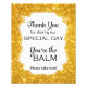 Este falso sinal brilhante de ouro será o perfeito elogio ao bar doce no seu chá de casamento. Ele apresenta um fundo brilhante de ouro com um recorte de quadro com a frase "Obrigado por compartilhar nosso dia especial Você é o balão Por favor pegue um".