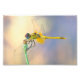 Fotografia de uma bela libélula amarela, azul, verde e preta numa ramificação verde. A luz amarela e as cinzas podem ser vistas pelas asas transparentes do inseto.
