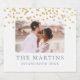 Esta elegante etiqueta de vinho do casamento mostra um elegante design de confete dourado com sua foto, novo sobrenome, e o ano do casamento em uma simples tipografia azul.