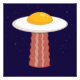 Vetor cartoon ilustra um delicioso e ensolarado OVNI fritado de ovo com um raio trator de fatia bacon delicioso. Palavras-chave: ovo, bacon, café da manhã, OVNI, alienígena, ensolarado, lado, desenho animado, espaço, extraterrestre, comida, fofo, gema, ficção científica, ficção, marciano, humor, carne, porco, rapto