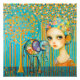 Um elefante estilizado e colorido fica ao lado de uma garota com olhos grandes e um chapéu branco, padronizado. Árvores pontilhadas e faixas verticais vibrantes enchem o fundo com um senso de fantasia e maravilha. Digital Art Photoshop CS5