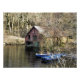 Um design fotográfico de barcos azuis e um velho galpão perto do lago.