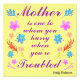 Emily Dickinson cita sobre o Dia de as mães " Mãe é uma a quem você se apressa quando você está perturbado ". A design mostra a citação em cor roxa rodeada de algumas flores e folhas em cores bonito: vermelho, roxo, azul, amarelo e laranja. É adequado como presente para sua mãe no Dia de as mães.