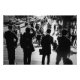 Uma fotografia impressionante de rua branca e negra que captura quatro empresários estrangeiros que olham para a cidade a partir da icônica Etapas Vermelhas. A cena é colocada num dia ensolarado, com suas silhuetas contrastando com o escurecido pano de fundo da Times Square, incorporando um momento de reflexão em meio à energia urbana