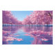 This high-resolution image captures a moment of serene spring beauty, showcasing an avenue of cherry blossom trees in full, vibrant pink bloom. The scene features a still body of water, possibly a pond or reflecting pool, its surface scattered with delicate floating petals and mirroring the saturated colors of the sky and the trees. The soft focus in the background draws the eye to the brilliant clarity of the foreground, highlighting the gentle ripples and the striking contrast between the deep, clear blue water and the ethereal pink foliage. This composition evokes feelings of tranquility, renewal, and the fleeting nature of beauty.