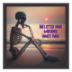 Esqueleto sentado sozinho numa praia com o pôr do sol ao fundo, refletindo em ... você escolhe. Dor infligida espelha dor interna.