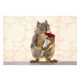Foto de um esquilo segurando uma buquê de rosas vermelhas com fundo de corações cor-de-rosa e brancos. O buquê de rosa do esquilo está embrulhado em papel prateado com um design de estrela. O esquilo está diante da câmera e segurando o buquê entre as patas. Uma fotografia de esquilo doce e divertida para qualquer pessoa que ame esquilos, ou que tenha um sentido de humor lúdico