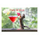 Um esquilo se posiciona sobre as pernas traseiras e bebe uma bebida tropical vermelha em um grande copo de martini através de uma palhinha de guarda-chuva nesta foto original. Há duas palhetas de guarda-chuva na bebida. O esquilo está parado em uma grade de madeira e há árvores verdes no fundo. "Animal da festa" está escrito em vermelho sobre a cabeça do esquilo. Uma imagem engraçada de esquilo que te dará risada!