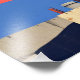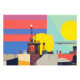 Uma paisagem industrial complexa é representada por estruturas de reboque silenciadas contra um céu verde. Um círculo azul em negrito contrasta com as nuvens texturizadas no fundo.