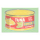 Uma ilustração retrógrada do estilo publicitário de uma lata de atum. Esta lata de peixe tem um rótulo que diz que o atum é elevado em Ômega 3 e que é pescado de forma sustentável. Mente para qualquer um que goste de comida enlatada