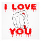 Eu te amo escrevendo com letras vermelhas que pingam sangue e um desenho de linha de uma mão feminina com um dedo indicador apontando para o espectador. Por diversão e Halloween