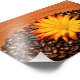 Vestuário com fotografia em tons quentes com grãos de café e margarida amarela pintada com laranja sobre fundo de madeira.