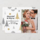 Cartões de Natal Festivos Casados e Felizes Apresentam um elegante padrão de árvore de Natal prateado e dourado em fundo branco. O texto Casado & Feliz é escrito em um script manual de cinzas moderno. Personalizado com sua própria mensagem e seus nomes editando o texto na caixa de texto fornecida. Adicione sua foto favorita. Ver outros itens nesta coleção desenhados por Feriados do Evco https://www.zazzle.com/store/evcoholidays
